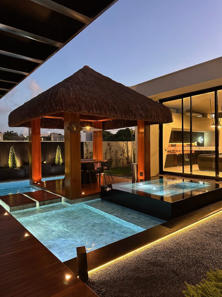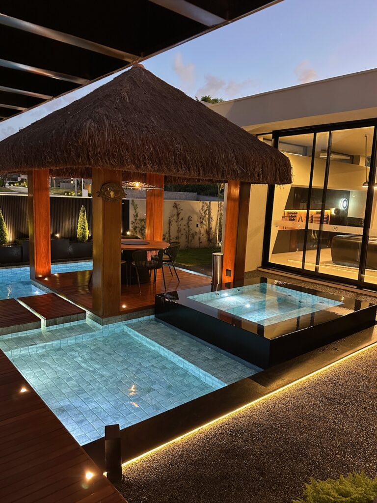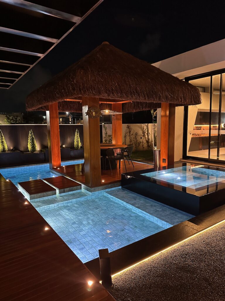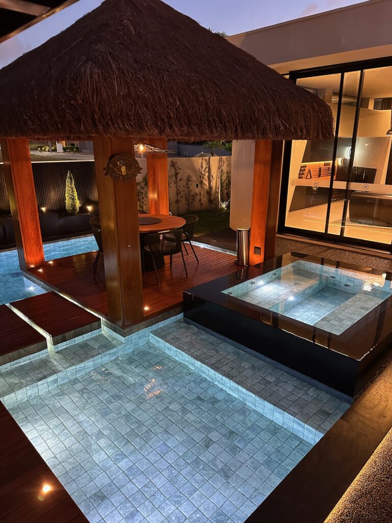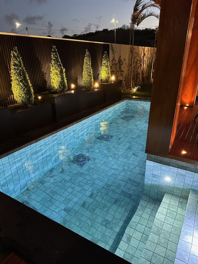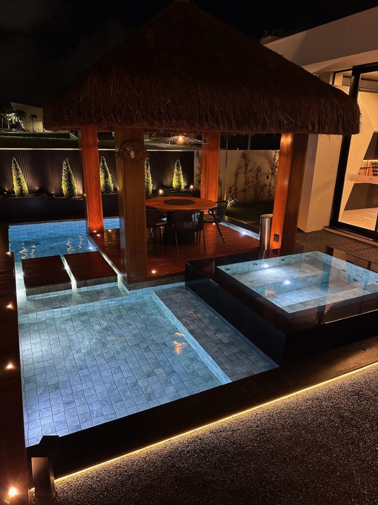 A piscina foi planejada com área infantil, área intermediária e região de maior profundidade para banho completo, atendendo diferentes perfis de uso com segurança e funcionalidade.