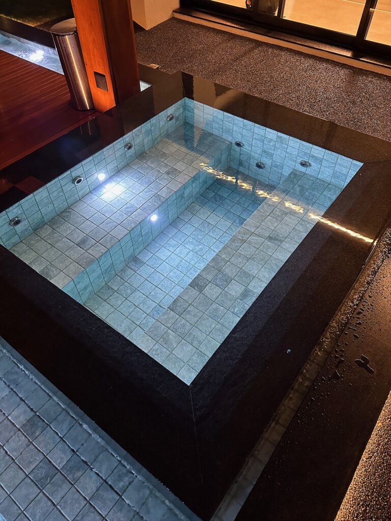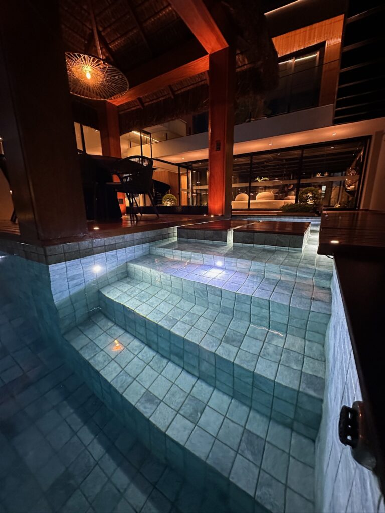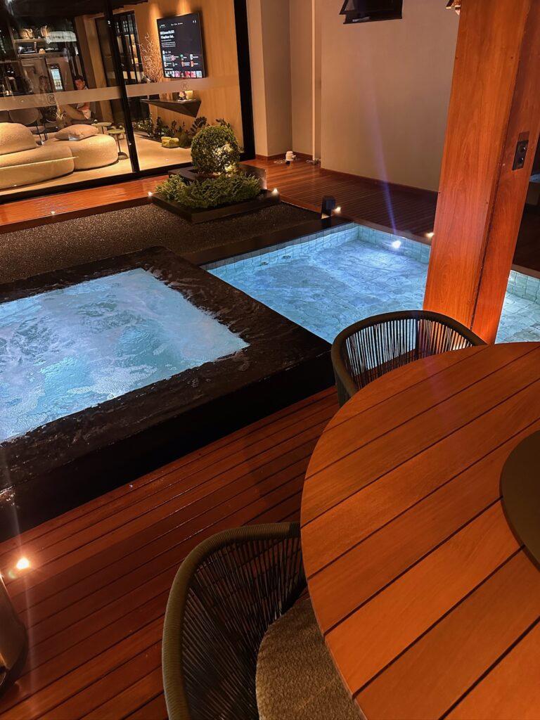 Foram aplicados retornos com efeito gêiser, projetados para gerar movimento e som contínuo da água. Esse recurso foi pensado especialmente para o espaço de leitura localizado no centro da piscina, proporcionando conforto acústico, relaxamento e sensação de bem-estar.